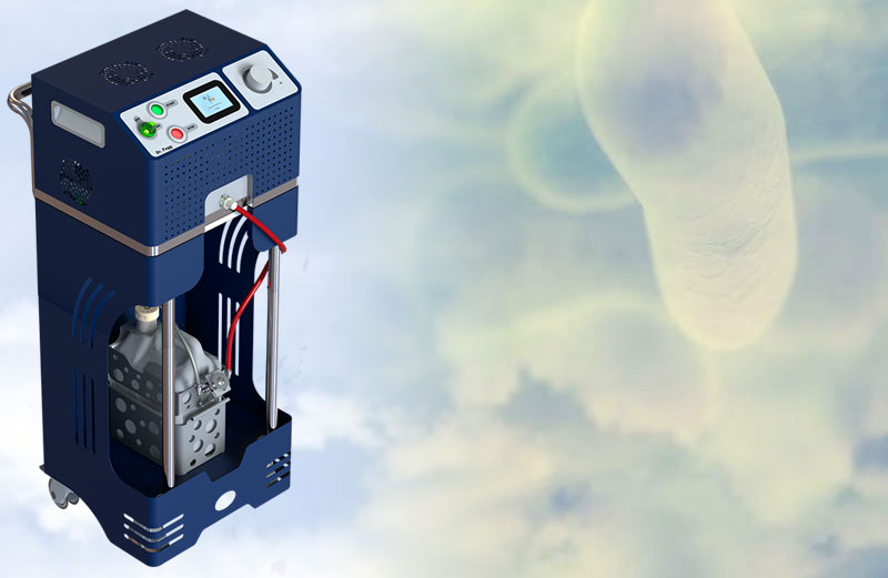 The Dr.Fogg™ aerosol generator sprays a solution of hydrogen peroxide with silver ions or peracetic acid (OXIDAG ™) to particles of 3 - 20 μm, creating a dry mist that penetrates into hard-to-reach and most remote areas, disinfecting all surfaces and air.
